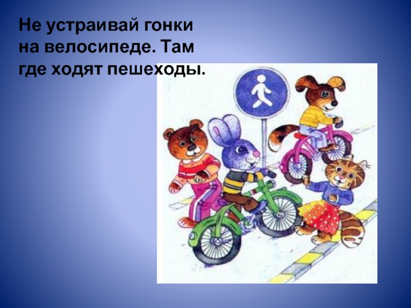 Слайд 25Не устраивай гонки на велосипеде. Там где ходят пешеходы.