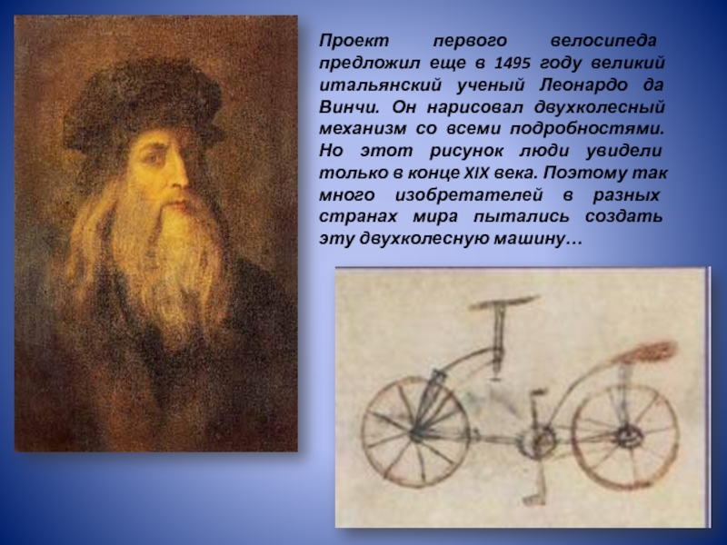 Слайд 5Проект первого велосипеда предложил еще в 1495 году великий итальянский ученый
