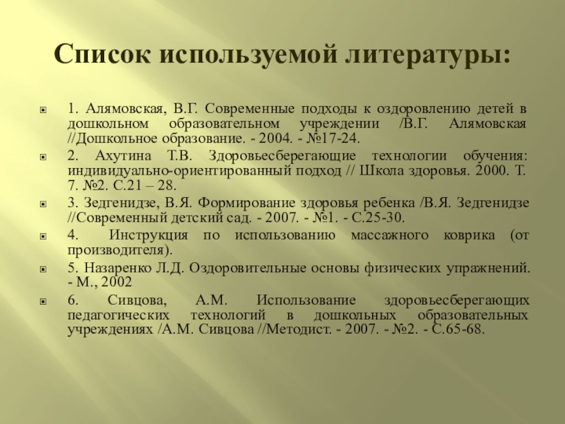 6. Сивцова, А.М. Использование здоровьесберегающих педагогических технологий в дошкольных образовательных учреждениях /А.М. Сивцова //Методист. - 2007. - №2. - С.65-68.