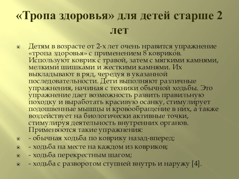 лет очень нравится упражнение «тропа здоровья» с применением 8 ковриков. Используют коврик с травой, затем с мягкими камнями, мелкими шишками и жесткими камнями. Их выкладывают в ряд, чередуя в указанной последовательности. Дети выполняют различные упражнения, начиная с техники обычной ходьбы. Это упражнение дает возможность развить правильную походку и выработать красивую осанку, стимулирует подошвенные мышцы и кровообращение в них, а также воздействует на биологически активные точки, стимулируя деятельность внутренних органов. Применяются такие упражнения: