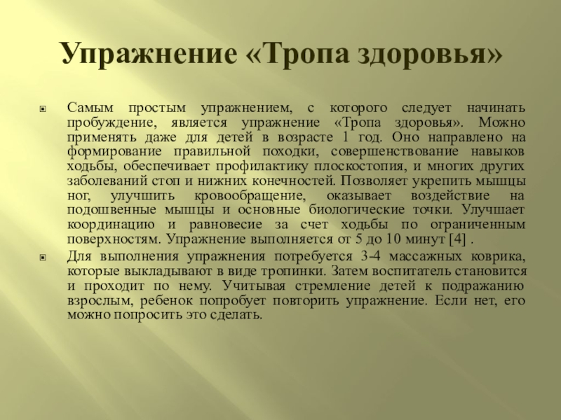 упражнение «Тропа здоровья». Можно применять даже для детей в возрасте 1 год. Оно направлено на формирование правильной походки, совершенствование навыков ходьбы, обеспечивает профилактику плоскостопия, и многих других заболеваний стоп и нижних конечностей. Позволяет укрепить мышцы ног, улучшить кровообращение, оказывает воздействие на подошвенные мышцы и основные биологические точки. Улучшает координацию и равновесие за счет ходьбы по ограниченным поверхностям. Упражнение выполняется от 5 до 10 минут [4] .