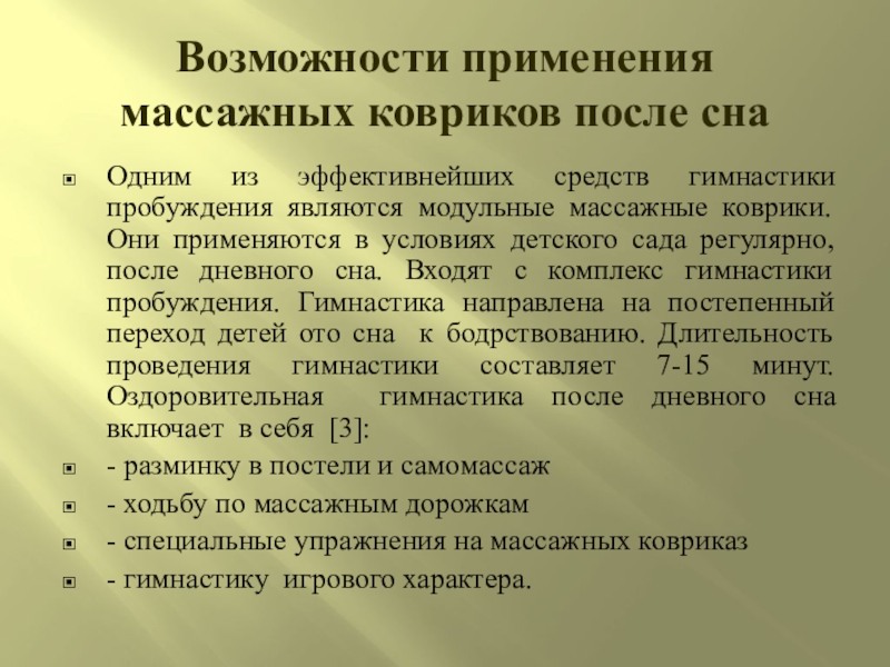 являются модульные массажные коврики. Они применяются в условиях детского сада регулярно, после дневного сна. Входят с комплекс гимнастики пробуждения. Гимнастика направлена на постепенный переход детей ото сна к бодрствованию. Длительность проведения гимнастики составляет 7-15 минут. Оздоровительная гимнастика после дневного сна включает в себя [3]: