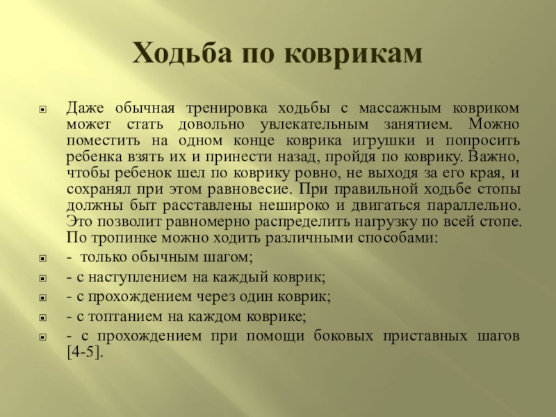 довольно увлекательным занятием. Можно поместить на одном конце коврика игрушки и попросить ребенка взять их и принести назад, пройдя по коврику. Важно, чтобы ребенок шел по коврику ровно, не выходя за его края, и сохранял при этом равновесие. При правильной ходьбе стопы должны быт расставлены нешироко и двигаться параллельно. Это позволит равномерно распределить нагрузку по всей стопе. По тропинке можно ходить различными способами: