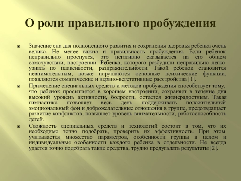 ребенка очень велико. Не менее важна и правильность пробуждения. Если ребенок неправильно проснулся, это негативно сказывается на его общем самочувствии, настроении. Ребенка, которого разбудили неправильно легко узнать по плаксивости, раздражительности. Такой ребенок становится невнимательным, позже нарушаются основные психические функции, появляются соматические и нервно-вегетативные расстройства [1].