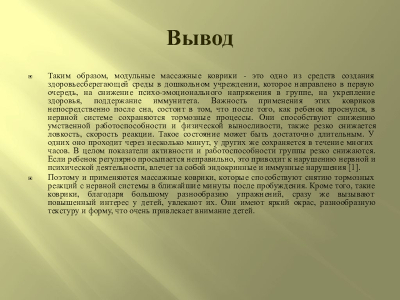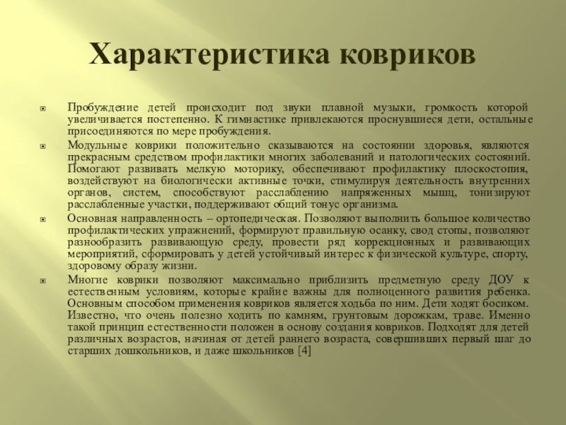 здоровьесберегающей среды в дошкольном учреждении, которое направлено в первую очередь, на снижение психо-эмоционального напряжения в группе, на укрепление здоровья, поддержание иммунитета. Важность применения этих ковриков непосредственно после сна, состоит в том, что после того, как ребенок проснулся, в нервной системе сохраняются тормозные процессы. Они способствуют снижению умственной работоспособности и физической выносливости, также резко снижается ловкость, скорость реакции. Такое состояние может быть достаточно длительным. У одних оно проходит через несколько минут, у других же сохраняется в течение многих часов. В целом показатели активности и работоспособности группы резко снижаются. Если ребенок регулярно просыпается неправильно, это приводит к нарушению нервной и психической деятельности, влечет за собой эндокринные и иммунные нарушения [1].