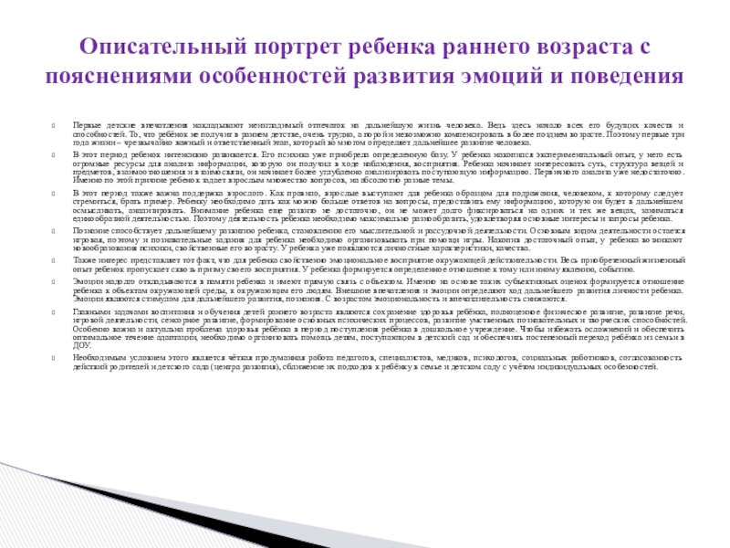 Описательный портрет ребенка раннего возраста с пояснениями особенностей развития эмоций и поведения