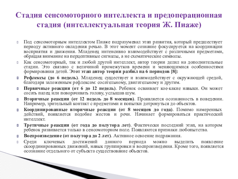 Стадия сенсомоторного интеллекта и предоперационная стадия (интеллектуальная теория Ж. Пиаже)