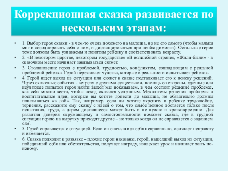 Коррекционная сказка развивается по нескольким этапам: