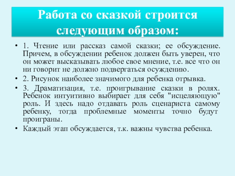сказки; ее обсуждение. Причем, в обсуждении ребенок должен быть уверен, что он может высказывать любое свое мнение, т.е. все что он ни говорит не должно подвергаться осуждению.