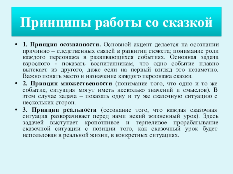 3. Принцип реальности (осознание того, что каждая сказочная ситуация разворачивает перед нами некий жизненный урок). Здесь задачей выступает кропотливое и терпеливое прорабатывание сказочной ситуации с позиции того, как сказочный урок будет использован в реальной жизни, в конкретных ситуациях.