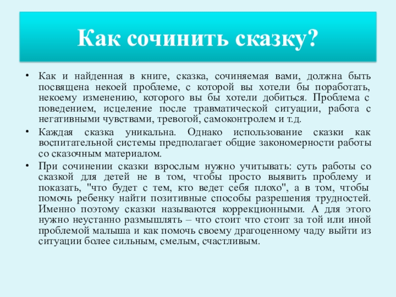 При сочинении сказки взрослым нужно учитывать: суть работы со сказкой для детей не в том, чтобы просто выявить проблему и показать, "что будет с тем, кто ведет себя плохо", а в том, чтобы помочь ребенку найти позитивные способы разрешения трудностей. Именно поэтому сказки называются коррекционными. А для этого нужно неустанно размышлять – что стоит что стоит за той или иной проблемой малыша и как помочь своему драгоценному чаду выйти из ситуации более сильным, смелым, счастливым.