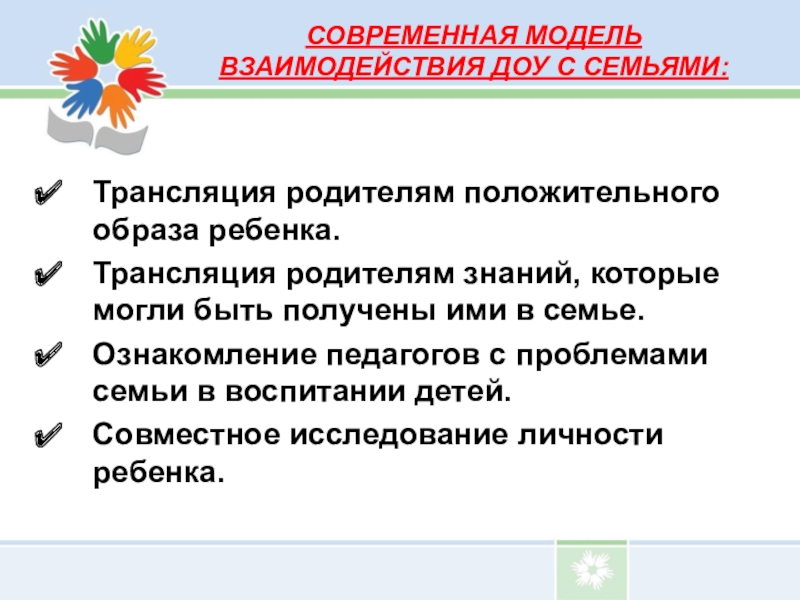 развития этих детей в помощь семье действует сеть дошкольных образовательных учреждений».