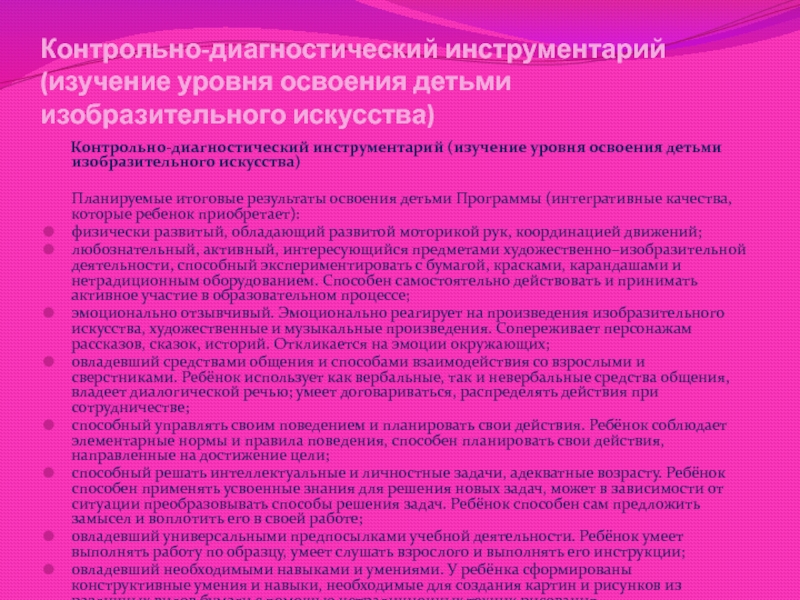 Слайд 19Контрольно-диагностический инструментарий (изучение уровня освоения детьми изобразительного искусства)