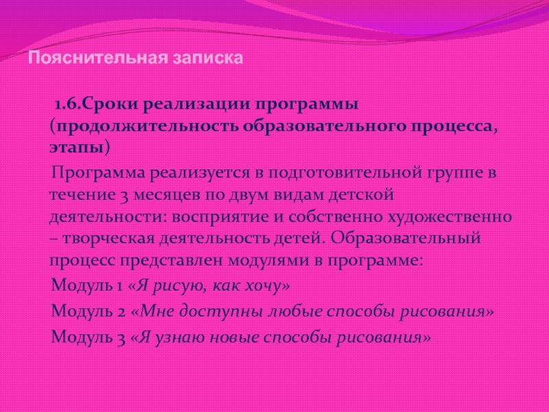 Программа реализуется в подготовительной группе в течение 3 месяцев по двум видам детской деятельности: восприятие и собственно художественно – творческая деятельность детей. Образовательный процесс представлен модулями в программе: