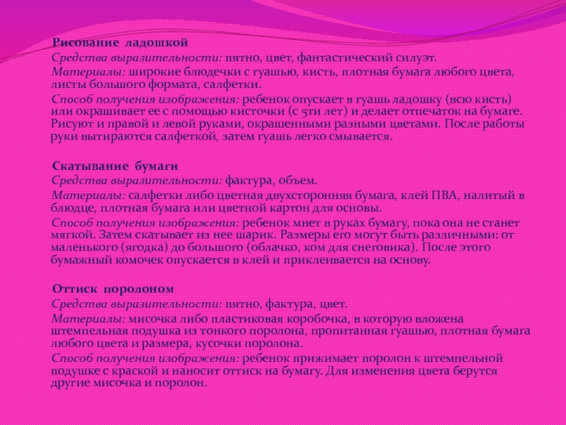 Способ получения изображения: ребенок опускает в гуашь ладошку (всю кисть) или окрашивает ее с помощью кисточки (с 5ти лет) и делает отпечаток на бумаге. Рисуют и правой и левой руками, окрашенными разными цветами. После работы руки вытираются салфеткой, затем гуашь легко смывается.