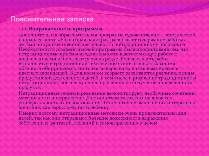 эстетической направленности «Волшебная палитра» раскрывает содержание работы с детьми по художественной деятельности: нетрадиционному рисованию. Необходимость создания данной программы была продиктована тем, что нетрадиционные приёмы изодеятельности в детском саду в работе с дошкольниками используются очень редко. Большая часть работ выполняется в традиционной технике рисования с использованием обычного оборудования: кисточек, акварельных и гуашевых красок и цветных карандашей. В дошкольном возрасте развиваются различные виды продуктивной деятельности детей, в том числе и рисование традиционное и нетрадиционное, поскольку оно направленно на получение определённого продукта.
