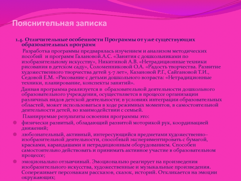 Разработка программы предварялась изучением и анализом методических пособий и программ Галановой.А.С. «Занятия с дошкольниками по изобразительному искусству», Никитиной А.В. «Нетрадиционные техники рисования в детском саду», Соломенниковой О.А. «Радость творчества. Развитие художественного творчества детей 5-7 лет», Казановой Р.Г., Сайгановой Т.И., Седовой Е.М. «Рисование с детьми дошкольного возраста: «Нетрадиционные техники, планирование, конспекты занятий».