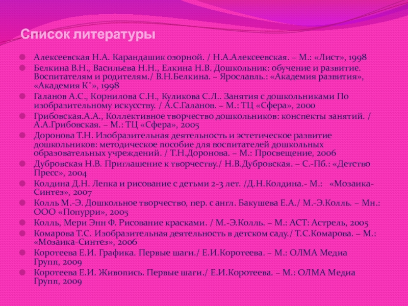 Доронова Т.Н. Изобразительная деятельность и эстетическое развитие дошкольников: методическое пособие для воспитателей дошкольных образовательных учреждений. / Т.Н.Доронова. – М.: Просвещение, 2006