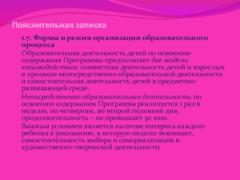 Важным условием является наличие интереса каждого ребенка к рисованию, в которую педагог вовлекает, самостоятельность выбора и самореализация в художественно-творческой деятельности