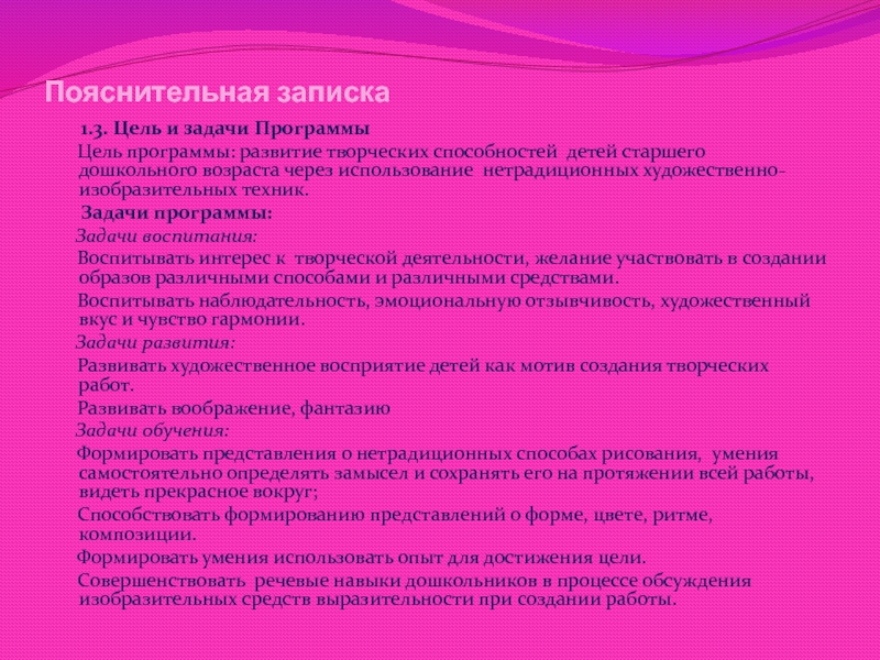 Цель программы: развитие творческих способностей детей старшего дошкольного возраста через использование нетрадиционных художественно-изобразительных техник.