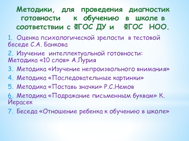 Слайд 17Методики, для проведения диагностик готовности к обучению в школе в