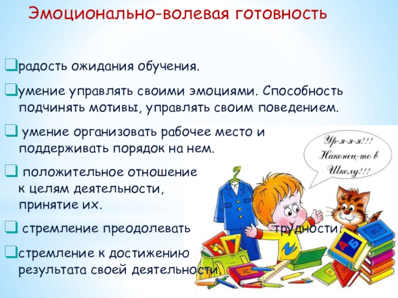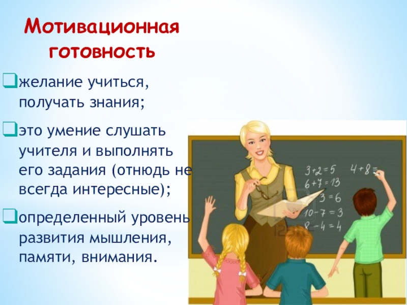 По мнению Л. И. Божович, готовность к школе складывается из определенного уровня развития мыслительной деятельности, произвольной регуляции и социальной позиции школьника.