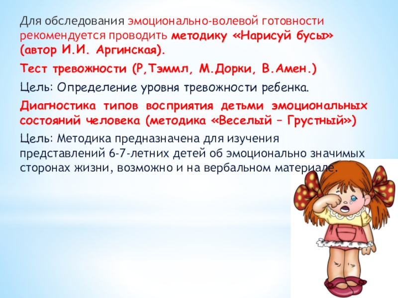 Слайд 13Для обследования эмоционально-волевой готовности рекомендуется проводить методику «Нарисуй бусы» (автор И.И.