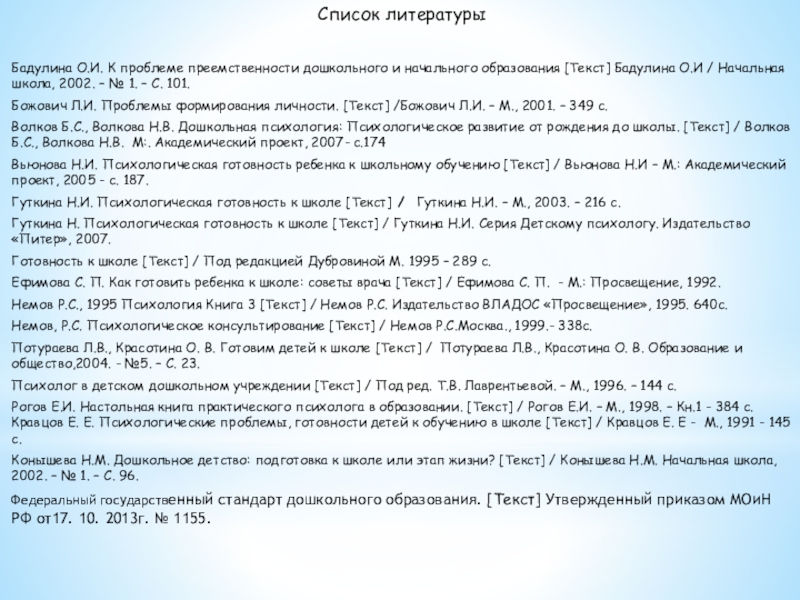 Рогов Е.И. Настольная книга практического психолога в образовании. [Текст] / Рогов Е.И. – М., 1998. – Кн.1 - 384 с. Кравцов Е. Е. Психологические проблемы, готовности детей к обучению в школе [Текст] / Кравцов Е. Е - М., 1991 - 145 с.