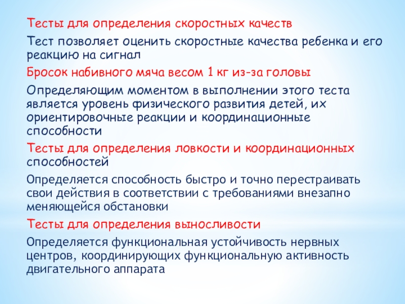 Определяющим моментом в выполнении этого теста является уровень физического развития детей, их ориентировочные реакции и координационные способности