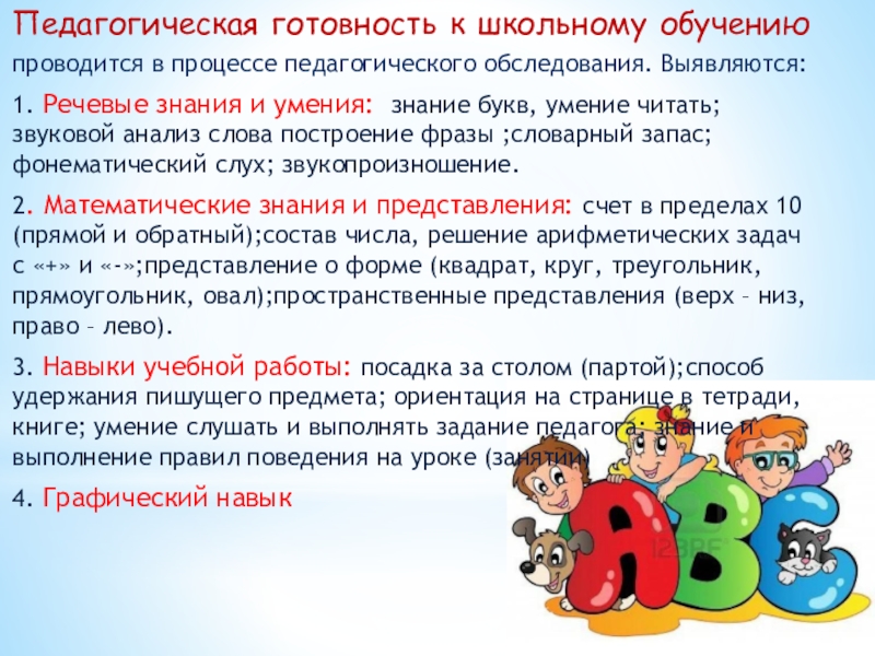 Речевые знания и умения: знание букв, умение читать; звуковой анализ слова построение фразы ;словарный запас; фонематический слух; звукопроизношение.