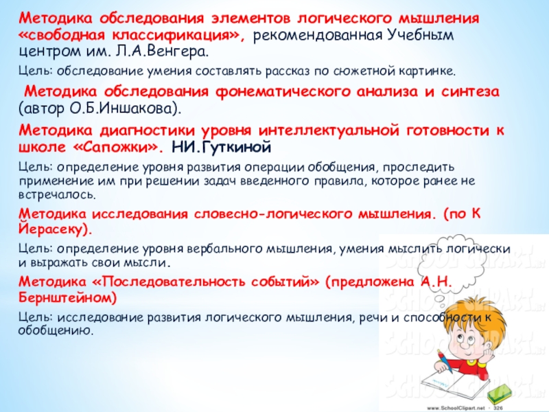 Слайд 9Методика обследования элементов логического мышления «свободная классификация», рекомендованная Учебным центром им.