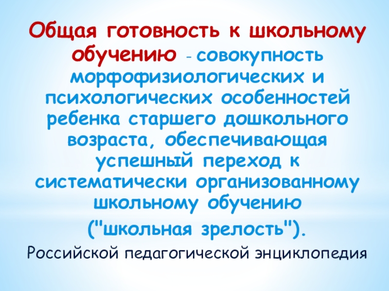 Слайд 3Общая готовность к школьному обучению – совокупность морфофизиологических и психологических особенностей