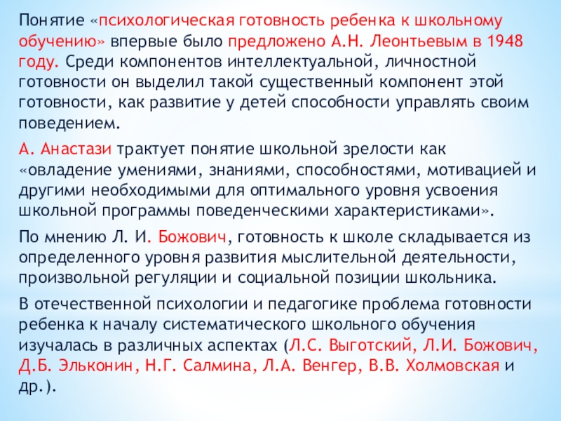 Леонтьевым в 1948 году. Среди компонентов интеллектуальной, личностной готовности он выделил такой существенный компонент этой готовности, как развитие у детей способности управлять своим поведением.