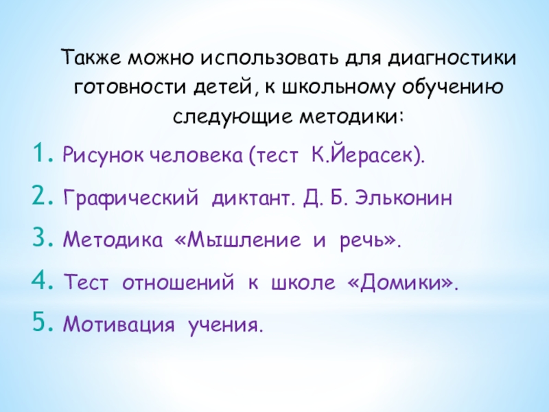 Слайд 18Также можно использовать для диагностики готовности детей, к школьному обучению следующие