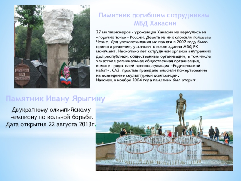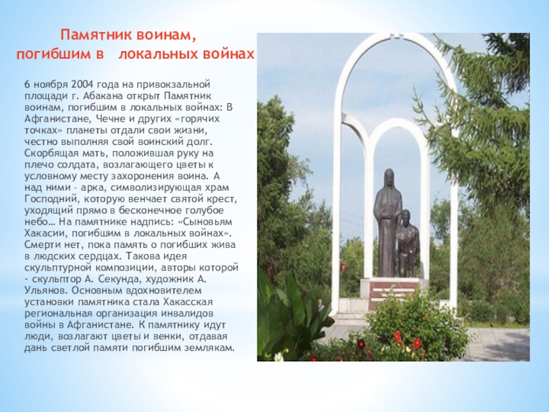 27 милиционеров - уроженцев Хакасии не вернулись из «горячих точек» России. Девять из них сложили головы в Чечне. Для увековечивания их памяти в 2002 году было принято решение, установить возле здания МВД РХ монумент. Несколько лет сотрудники органов внутренних дел республики, общественные организации, в том числе хакасская региональная общественная организация, комитет родителей военнослужащих «Родительский набат», САЗ, простые граждане вносили пожертвования на возведение скульптурной композиции.