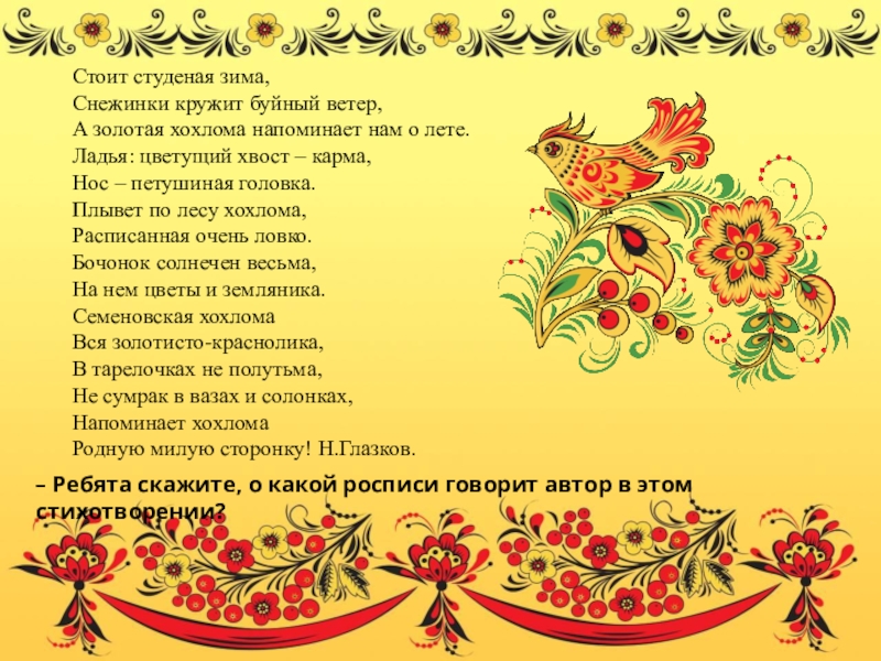 – Ребята скажите, о какой росписи говорит автор в этом стихотворении?