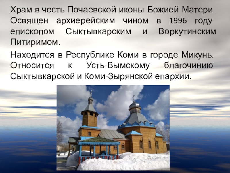 Презентация, доклад по духовно-нравственному воспитанию История Почаевской церкви г.Микунь