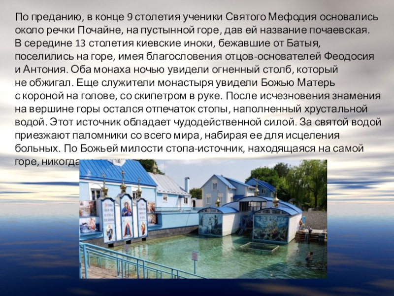 горе, дав ей название почаевская. В середине 13 столетия киевские иноки, бежавшие от Батыя, поселились на горе, имея благословения отцов-основателей Феодосия и Антония. Оба монаха ночью увидели огненный столб, который не обжигал. Еще служители монастыря увидели Божью Матерь с короной на голове, со скипетром в руке. После исчезновения знамения на вершине горы остался отпечаток стопы, наполненный хрустальной водой. Этот источник обладает чудодейственной силой. За святой водой приезжают паломники со всего мира, набирая ее для исцеления больных. По Божьей милости стопа-источник, находящаяся на самой горе, никогда не оскудевает.