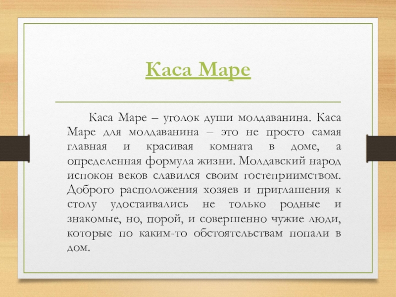 Каса Маре для молдаванина – это не просто самая главная и красивая комната в доме, а определенная формула жизни. Молдавский народ испокон веков славился своим гостеприимством. Доброго расположения хозяев и приглашения к столу удостаивались не только родные и знакомые, но, порой, и совершенно чужие люди, которые по каким-то обстоятельствам попали в дом.