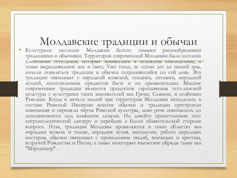 обычаями. Территория современной Молдавии была заселена племенами гето-даков, которые занимались в основном земледелием, а также выращиванием коз и овец. Уже тогда, за сотни лет до нашей эры, начали появляться традиции и обычаи сохранившийся по сей день. Это традиции связанные с народной музыкой, танцами, песнями, народной кухней, изготовлением предметов быта и их орнаментации. Многие современные традиции являются продуктом скрещивания гето-дакской культуры с культурами таких завоевателей как Греки, Славяне, и особенно Римляне. Когда в начале нашей эры территория Молдавии находилась в составе Римской Империи многие обычаи и традиции претерпели изменения и переняли черты Римской культуры, даже речь изменилось до неузнаваемости под влиянием латыни. Но давайте приостановим этот антропологический дискурс и перейдем к более обывательской стороне вопроса. Итак, традиции Молдовы проявляются в таких областях как народная музыка и танцы, народная кухня, виноделие, работа народных мастеров, обычаи связанные с проведением свадеб, венчании и крестин, встречей Рождества и Пасхи, а также некоторые языческие обряды такие как "Мэрцишор".