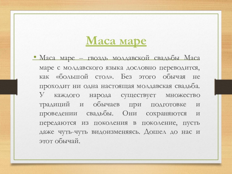 языка дословно переводится, как «большой стол». Без этого обычая не проходит ни одна настоящая молдавская свадьба. У каждого народа существует множество традиций и обычаев при подготовке и проведении свадьбы. Они сохраняются и передаются из поколения в поколение, пусть даже чуть-чуть видоизменяясь. Дошел до нас и этот обычай.