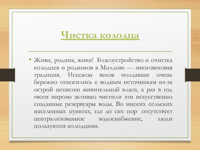 Молдове — многовековая традиция. Испокон веков молдаване очень бережно относились к водным источникам из-за острой нехватки живительной влаги, а раз в год «всем миром» активно чистили эти искусственно созданные резервуары воды. Во многих сельских населенных пунктах, где до сих пор отсутствует централизованное водоснабжение, люди пользуются колодцами.