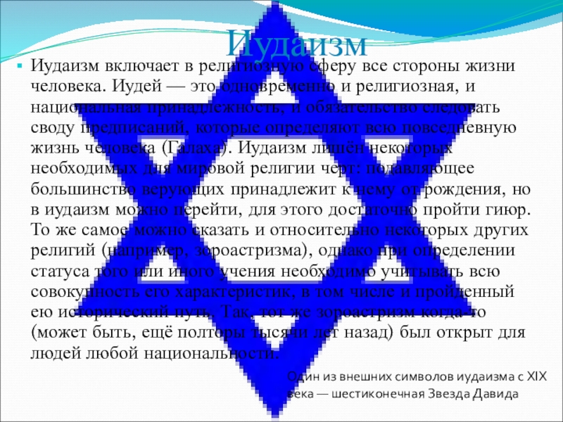Один из внешних символов иудаизма с XIX века — шестиконечная Звезда Давида