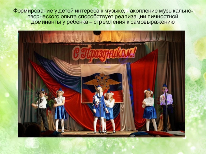 Слайд 12Формирование у детей интереса к музыке, накопление музыкально-творческого опыта способствует реализации