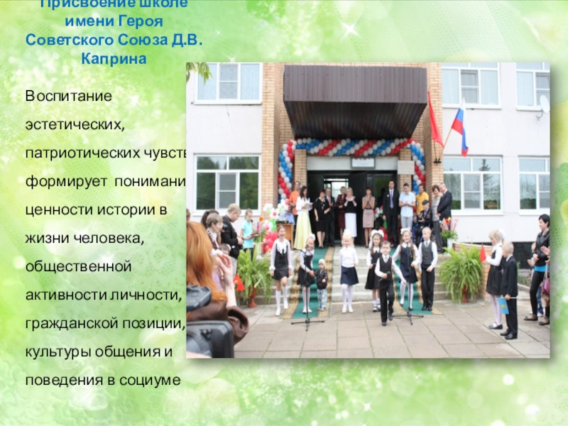 Слайд 5Присвоение школе имени Героя Советского Союза Д.В. Каприна