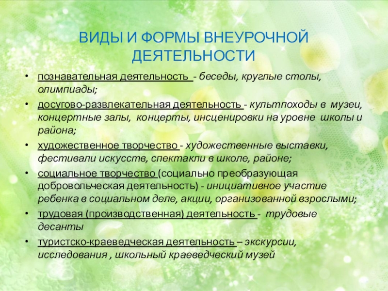 Слайд 4ВИДЫ И ФОРМЫ ВНЕУРОЧНОЙ ДЕЯТЕЛЬНОСТИ