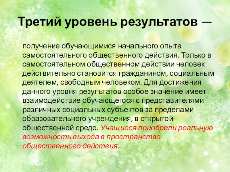 общественного действия. Только в самостоятельном общественном действии человек действительно становится гражданином, социальным деятелем, свободным человеком. Для достижения данного уровня результатов особое значение имеет взаимодействие обучающегося с представителями различных социальных субъектов за пределами образовательного учреждения, в открытой общественной среде. Учащиеся приобрели реальную возможность выхода в пространство общественного действия.