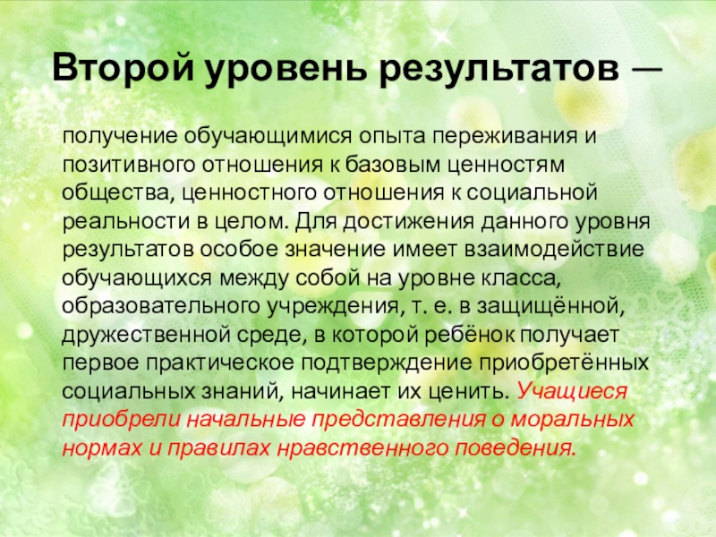 позитивного отношения к базовым ценностям общества, ценностного отношения к социальной реальности в целом. Для достижения данного уровня результатов особое значение имеет взаимодействие обучающихся между собой на уровне класса, образовательного учреждения, т. е. в защищённой, дружественной среде, в которой ребёнок получает первое практическое подтверждение приобретённых социальных знаний, начинает их ценить. Учащиеся приобрели начальные представления о моральных нормах и правилах нравственного поведения.