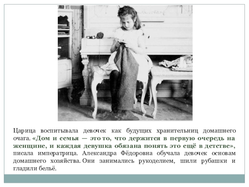 Слайд 9Царица воспитывала девочек как будущих хранительниц домашнего очага. «Дом и семья —