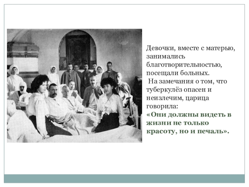 Слайд 10Девочки, вместе с матерью, занимались благотворительностью, посещали больных.